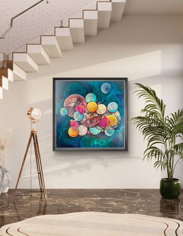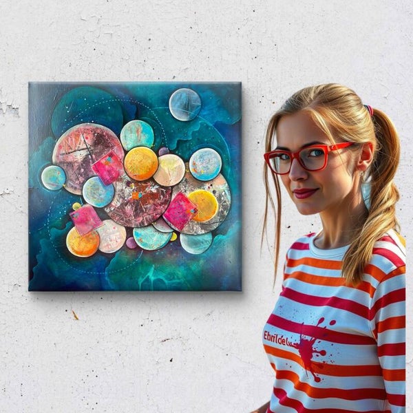 "Dans ma bulle" peut être perçue comme une métaphore de l'introspection et de l'isolement volontaire. Chaque bulle représente un espace personnel, intime, où l'individu peut se réfugier et réfléchir. Les formes et les couleurs symbolisent différentes émotions et pensées qui émergent dans ces moments de solitude. L'œuvre invite à contempler la beauté de cet espace intérieur, où se mêlent chaos et harmonie, agitation et sérénité, soulignant l'importance de prendre du temps pour soi dans un monde souvent tumultueux.