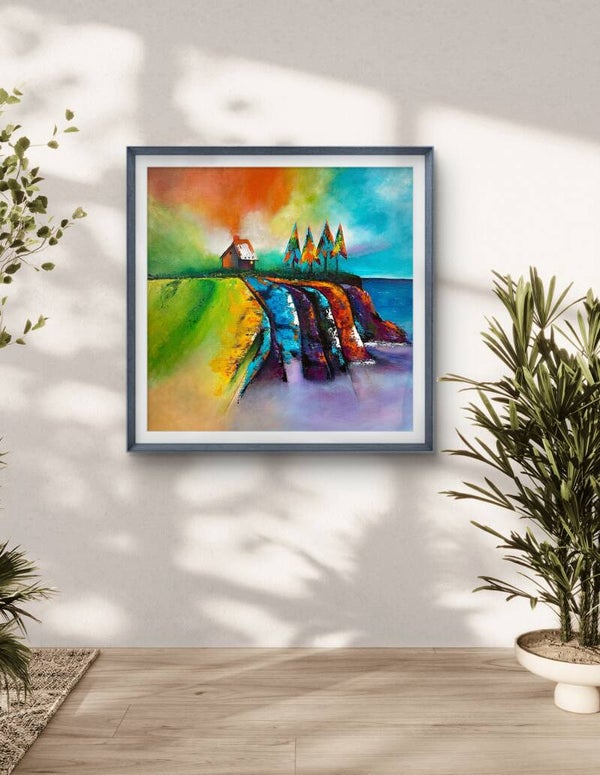 Dans ce tableau, une petite maison solitaire se dresse sur une crête verdoyante, entourée d'une explosion chromatique qui défie le spectateur. Le ciel est un nuancier audacieux de vert et d’orange, semblant embraser l'horizon. À droite de la maison, une rangée d’arbres élancés, peints de couleurs vives et chaudes, contraste avec le ciel bleu électrique qui se fond dans les profondeurs d'une mer calme. Les racines terreuses, faites de traits audacieux en bleu et violet, se transforment en falaises abruptes plongeant dans l'océan.