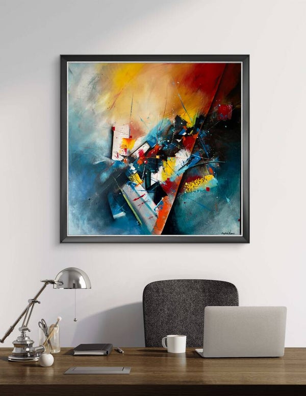 Le tableau est une symphonie visuelle où l'acrylique et les encres acryliques se rencontrent sur la toile de 60x60 cm, sous la guidance d’outils variés tels que le spalter, le pinceau et le couteau. Ici, le dripping ajoute une impertinence vivante, insufflant à l'œuvre un rythme effréné, révélant les mouvements invisibles du temps et de l'espace.