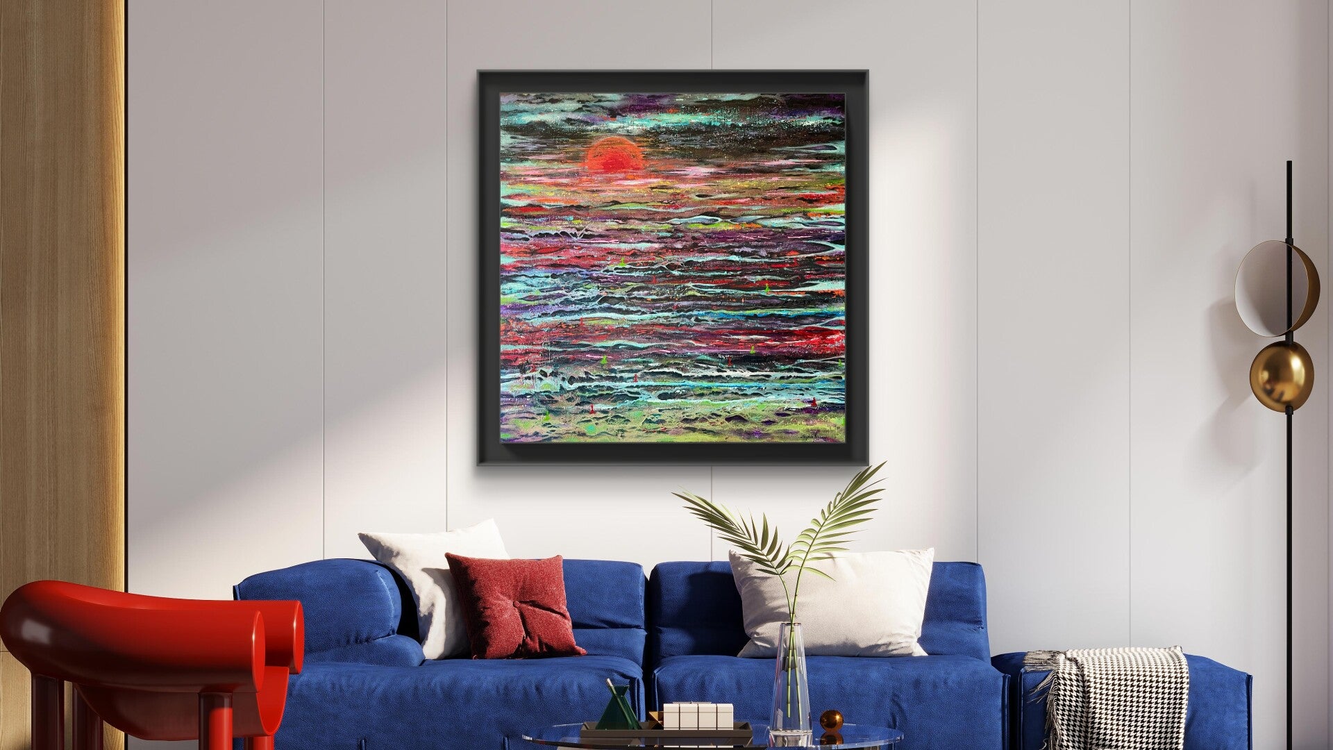 "Rivage ou Mirage ?" est une œuvre abstraite réalisée à la peinture et aux encres acryliques. Ce tableau constitue un voyage visuel dans un monde où les frontières entre le réel et l’illusoire s’estompent. Les couleurs s'entremêlent dans un jeu de nuances vibrantes, évoquant un crépuscule onirique où ciel et mer se confondent.