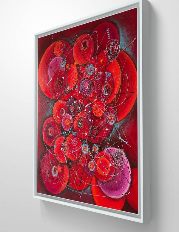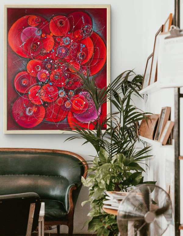 « Pas Sage » se distingue par un mélange vibrant de rouges et de nuances orangées, entrelacées de cercles et de motifs géométriques. Ces formes semblent s’entrelacer en une danse harmonieuse, offrant au spectateur un spectacle dynamique et captivant. Chaque cercle, chaque ligne raconte une histoire unique, un voyage à la découverte d'un univers abstrait rempli d’émotions et de vie.